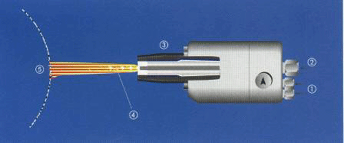 1-Brenngas/Sauerstoff , 2-Pulver + Fördergas, 3-Brennerdüse, 4-Flamme, 5-Werkstück |